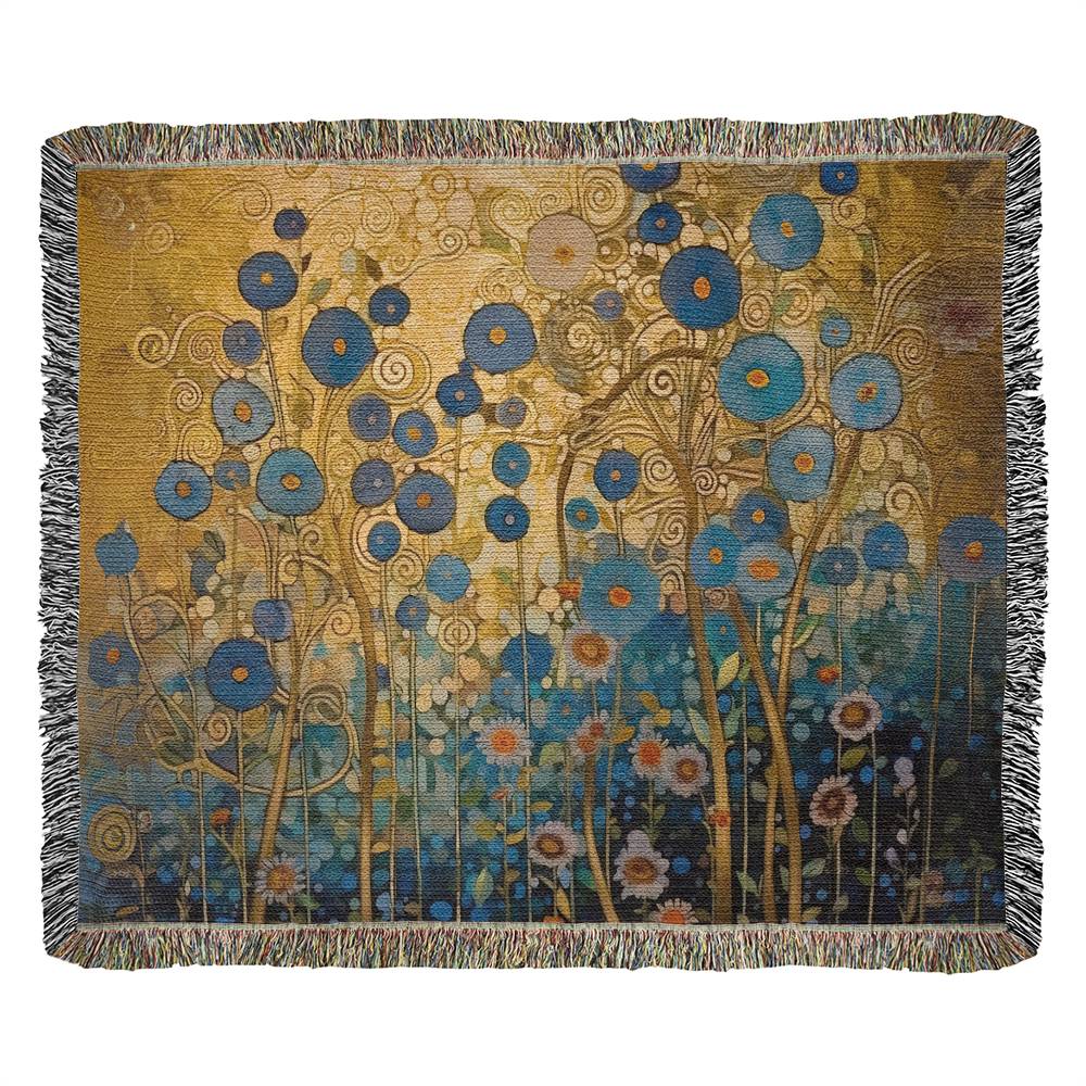 Transform your home into a work of art with this Klimt Inspired 100% Cotton Blue and Gold Floral Woven Blanket Throw. Featuring rich blue and shimmering gold tones with an elegant Art Nouveau floral design, this luxury tapestry-style throw adds timeless sophistication to any room. Perfect for draping across your bed, sofa, or armchair, it doubles as a functional blanket and a stunning piece of wall art.