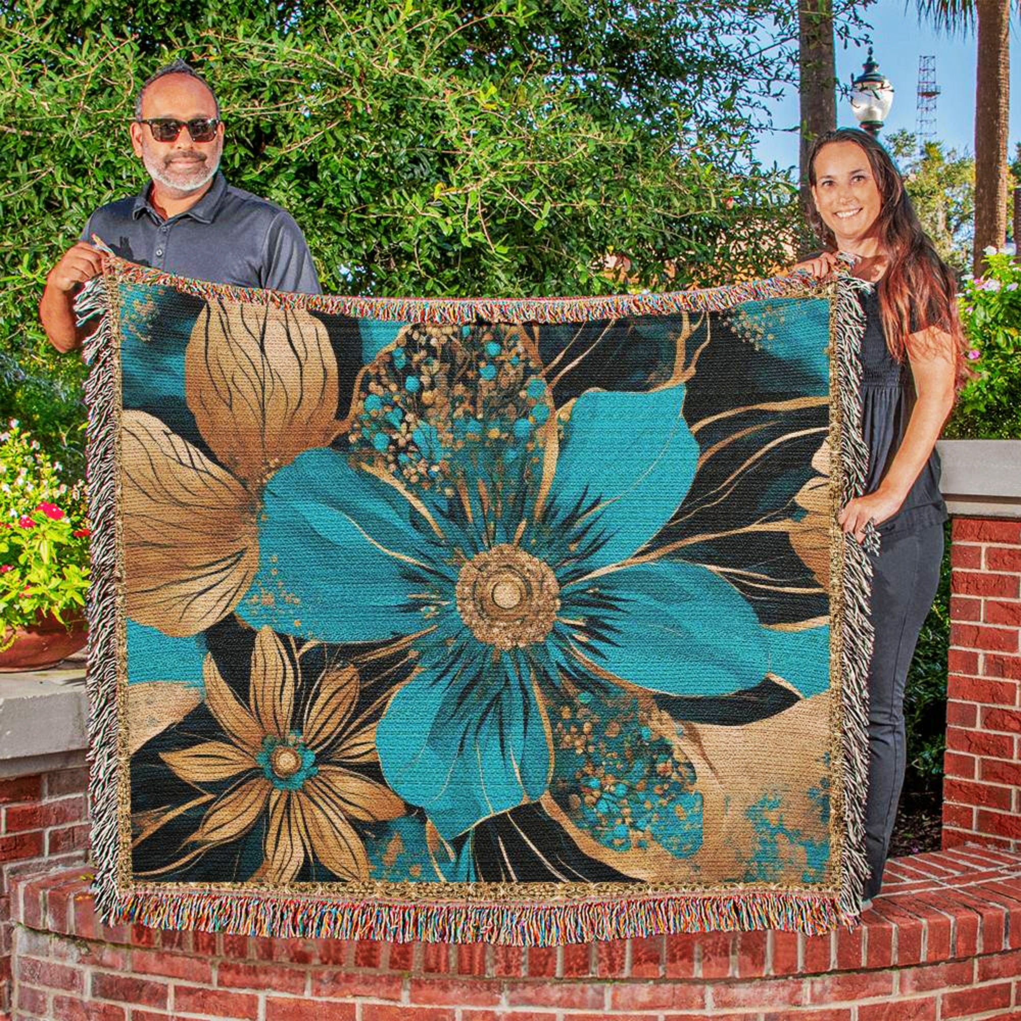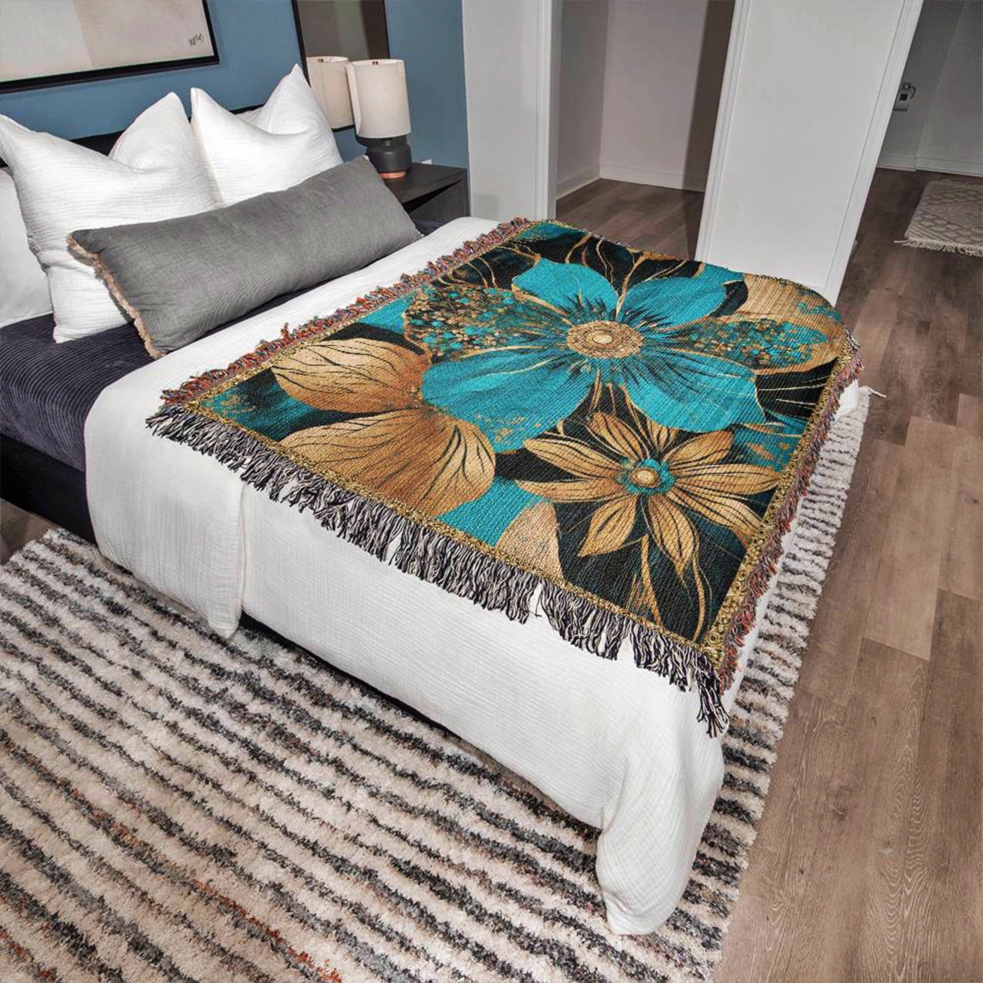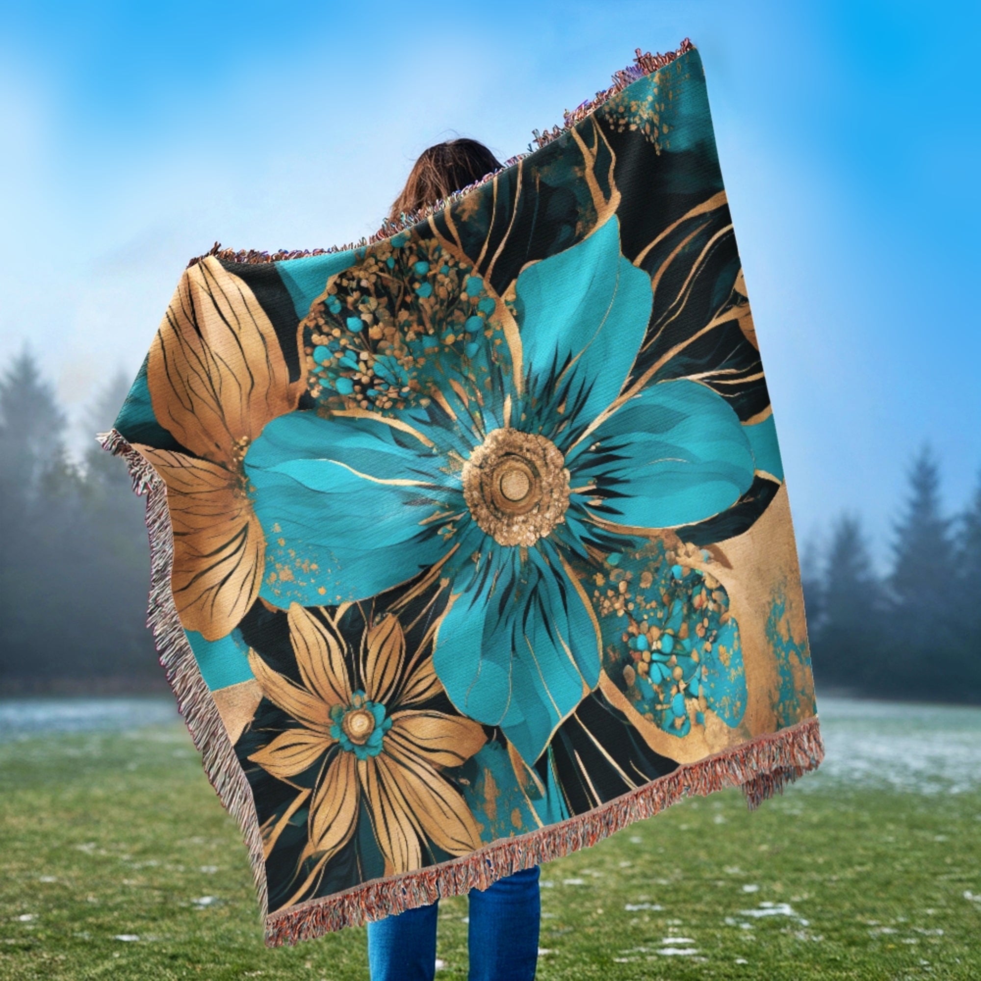 Add a touch of timeless bohemian charm to your home with this stunning Boho Flowers woven blanket. Designed in rich teal and gold tones, this 100% cotton throw is not only soft and cozy but also a beautiful decorative accent for your couch, bed, or sofa. Perfect as a tapestry wall hanging, stylish bedspread, or boho home décor piece, this versatile blanket brings warmth and artistry to any space.